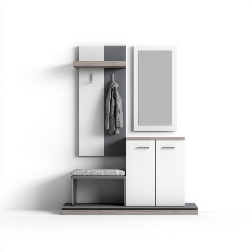 Perchero de estilo moderno compuesto por panel con gancho metálico, banco acolchado y módulo inferior de almacenamiento. Su diseño geométrico combina tonos neutros y líneas limpias para aportar funcionalidad y estética al recibidor.