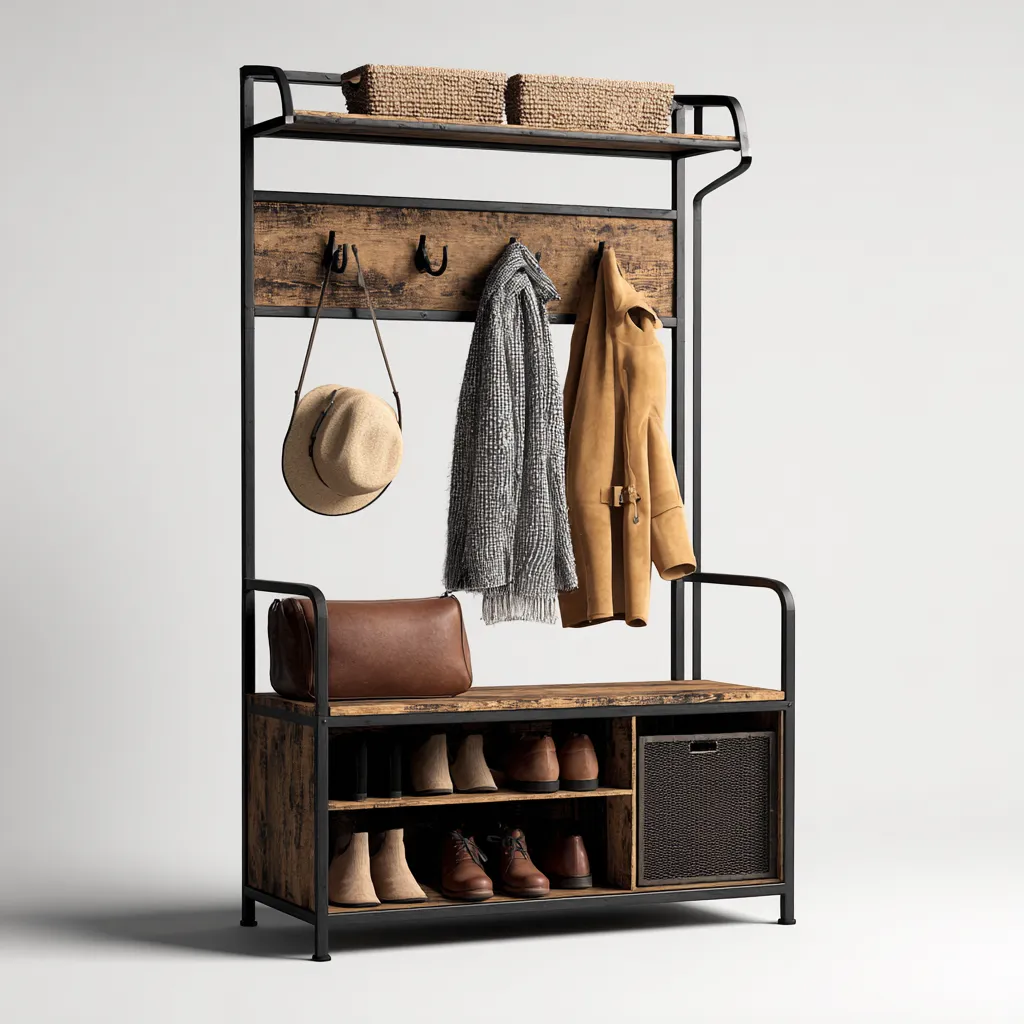 Perchero de estilo industrial con estructura metálica y superficies en madera oscura, pensado para organizar prendas, accesorios y calzado en la entrada del hogar o en el dormitorio. Su diseño abierto ofrece un acceso cómodo a los artículos de uso diario y aporta un aspecto robusto y acogedor al espacio.