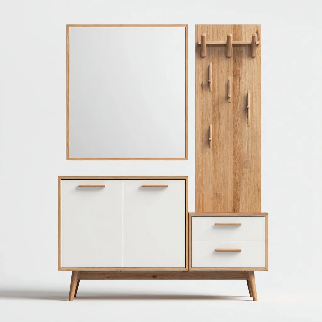 Este perchero de entrada combina un diseño moderno con una estructura en madera clara y frentes en color blanco, ofreciendo una solución funcional para la organización del hogar. Incluye un panel con ganchos, un módulo con puertas y cajones, y un espejo amplio para facilitar la preparación diaria.