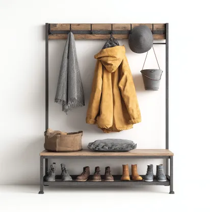 Este perchero de entrada ofrece un diseño industrial con una estructura abierta que permite organizar prendas y calzado de manera práctica. Su combinación de madera y metal crea un estilo equilibrado y fácil de integrar en distintos espacios del hogar.