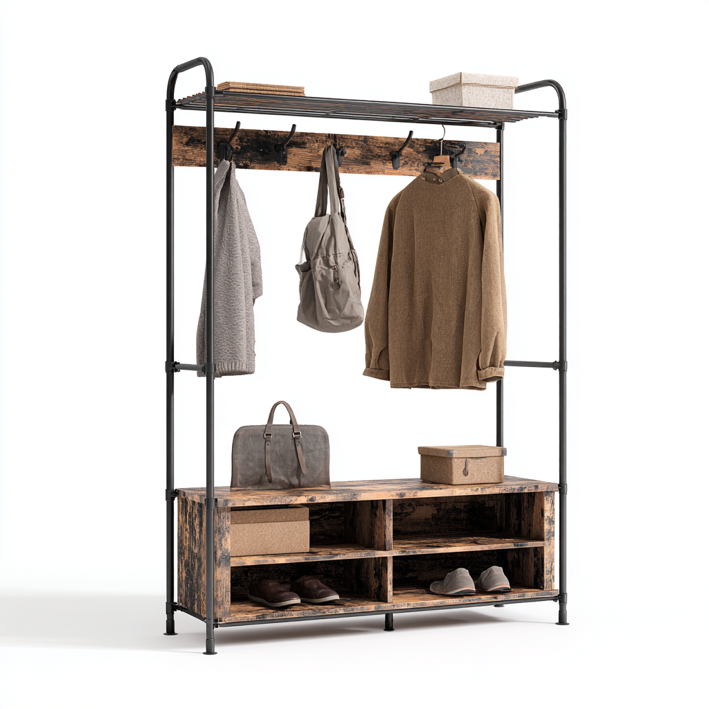 Este perchero de entrada ofrece un diseño industrial con una estructura alta que combina metal y madera rústica. Proporciona amplias zonas para colgar prendas y múltiples compartimentos abiertos en la parte inferior para mejorar la organización del hogar.